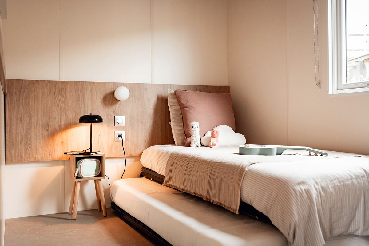 - 1 bedroom with 2 single beds (80) or 2 beds (80) and a trundle bed (70) (reserved for children under 40kg) depending on model