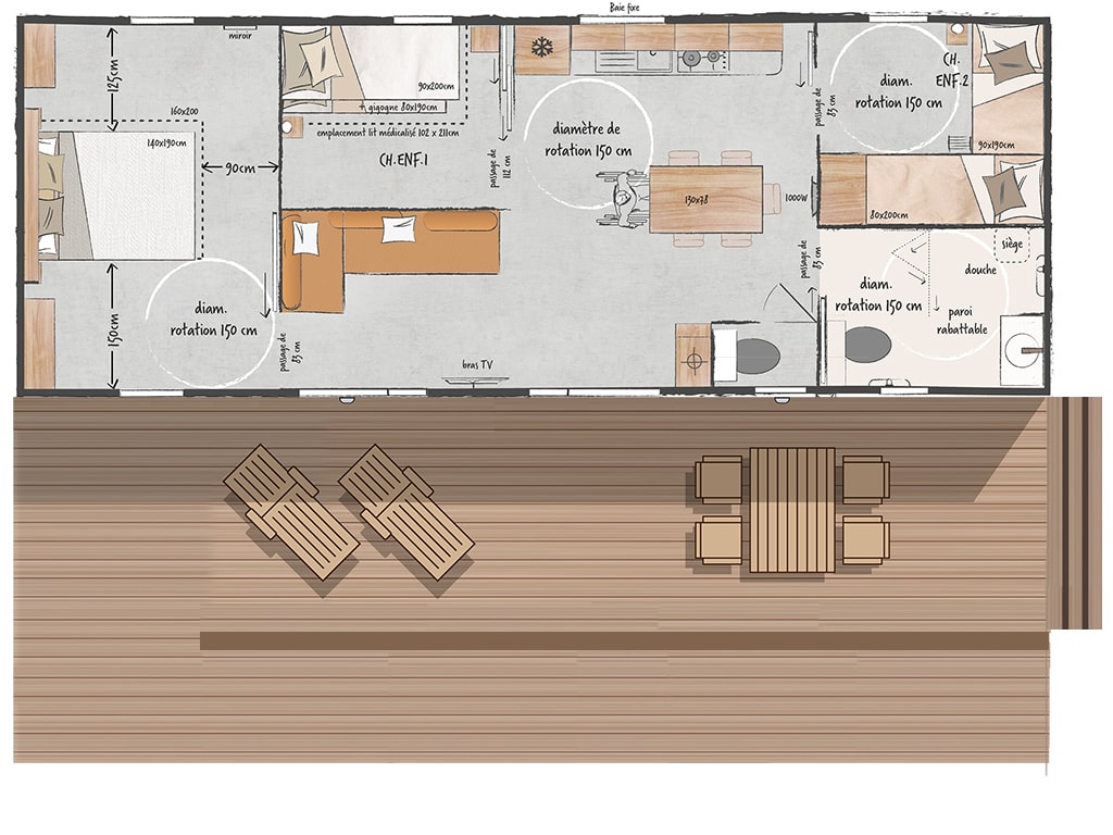 The configuration of this mobile home is perfect for group vacations, offering all the comfort your tribe needs! The spacious living area is surrounded on either side by sleeping areas, ensuring the privacy of the occupants: 2 families with 2 children each, or a group of friends. The terrace is covered, surrounded by a balustrade and closed by a gate.